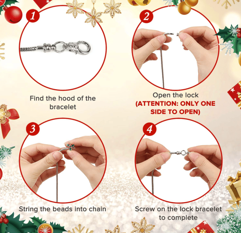 - A Christmas advent calendar with 22 Charm Beads and 2 Bracelet Chains to make 2 Christmas bracelets