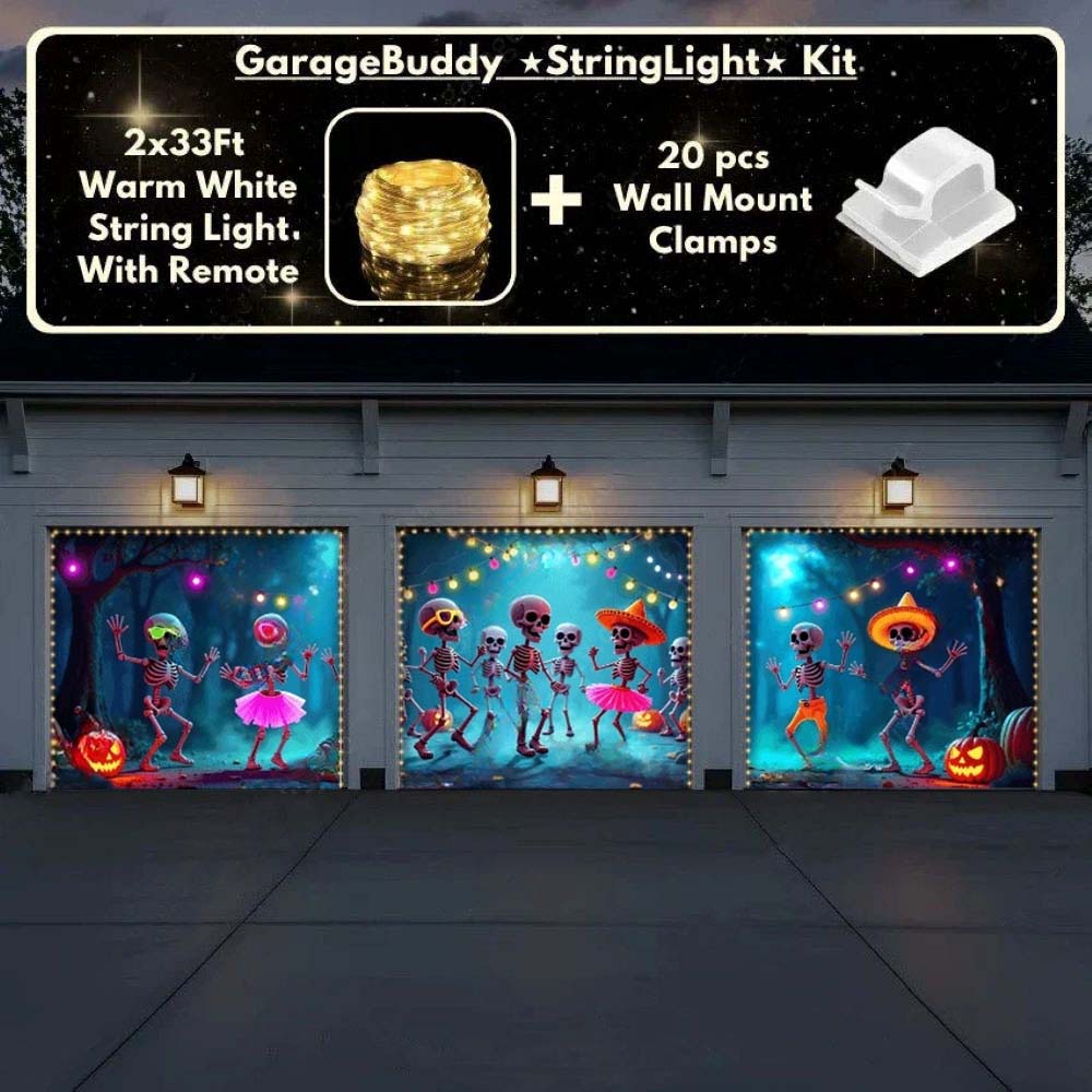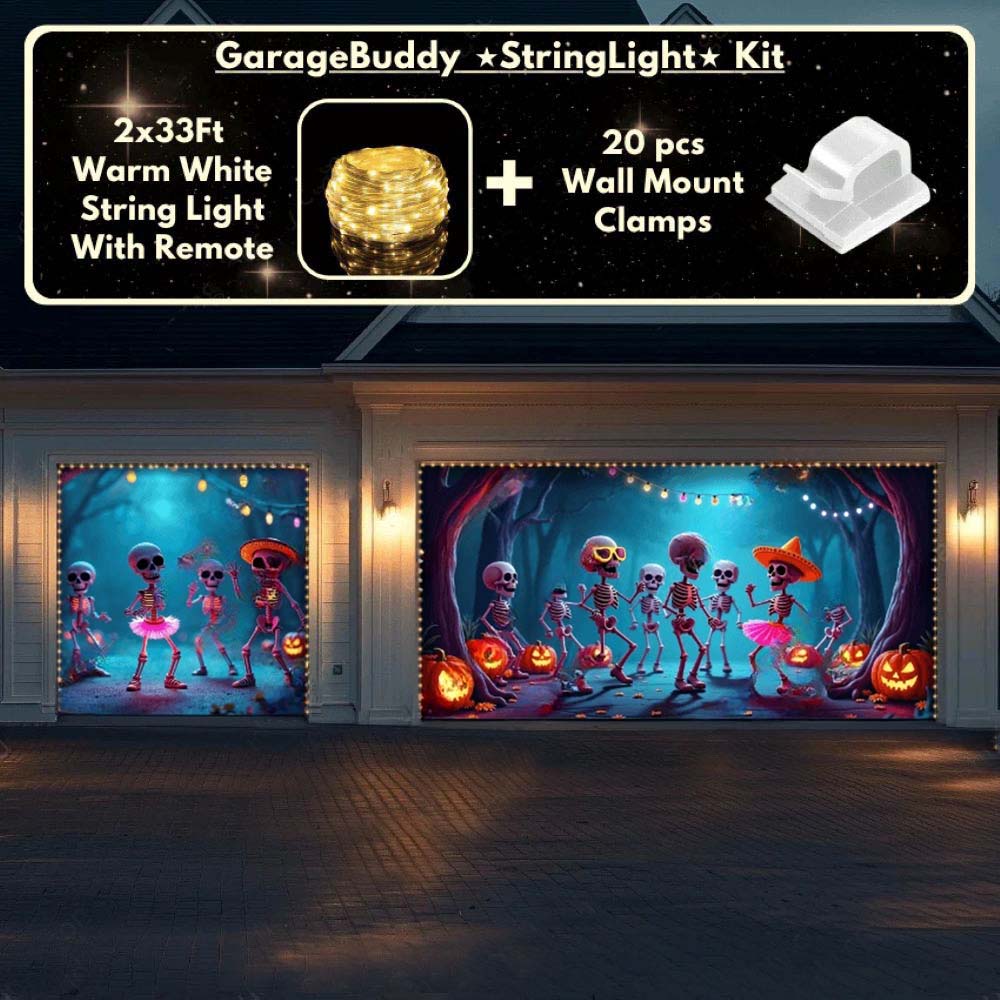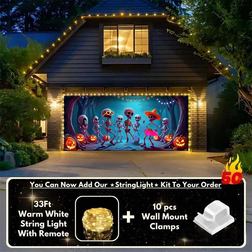 Skeletons in tutus, sunglasses, and sombreros? Yes, please! The Boogie Bones Halloween Garage Door Cover lets your Halloween décor scream fun with a lively, lighthearted twist. This playful yet spooky design is perfect for homeowners who want their Halloween setup to be both creepy and entertaining.