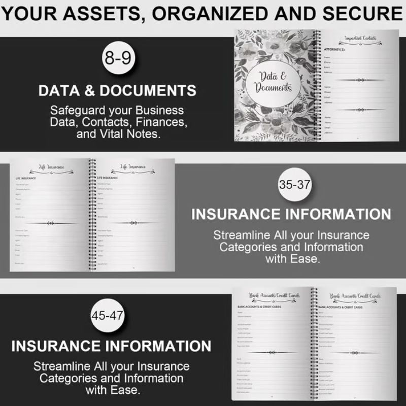 Keep all your important information in one place - dependents, beneficiaries, pets, insurance, accounts, passwords, and more. Each section is clearly organized to ensure nothing is overlooked when it comes to your final wishes.
