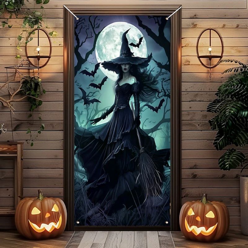 Keywords: Halloween door cover, witch door decoration, front door Halloween banner, outdoor Halloween decor, farmhouse Halloween door curtain, durable Halloween tapestry.
