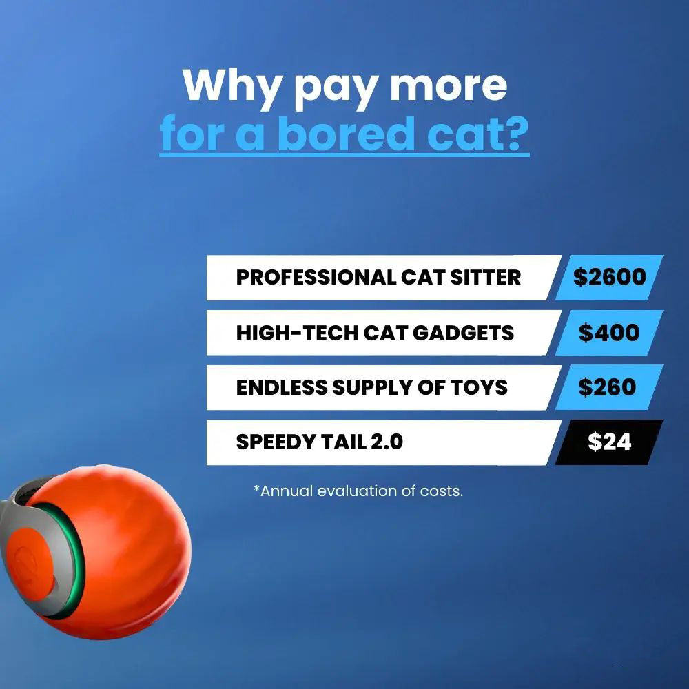 Most cat toys are either too slow, too noisy, or just plain boring. They get stuck under furniture and wear out fast. The Speedy Tail 2.0 provides endless entertainment, works smoothly on any surface, and is incredibly durable - saving you time and money.